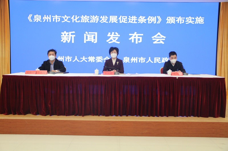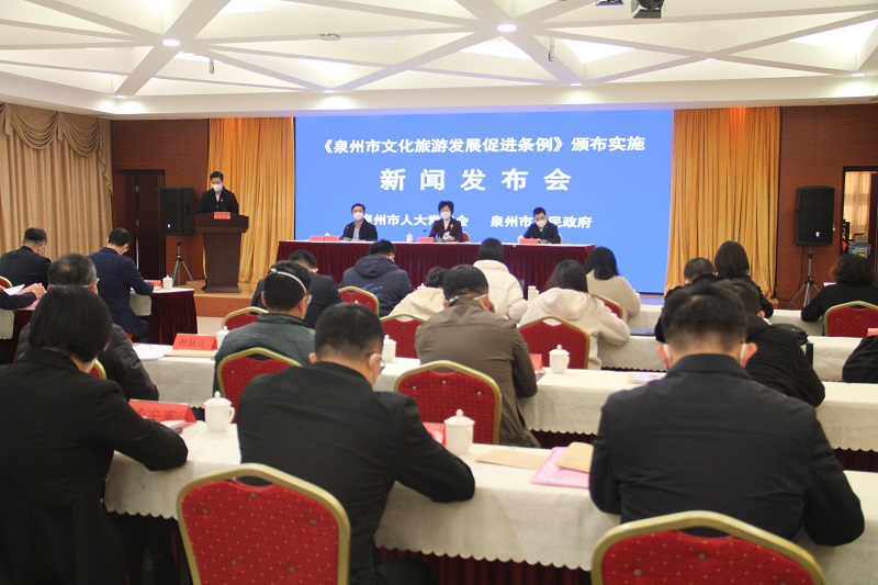 12月21日,市人大常委会和市人民政府联合召开《泉州市文化旅游发展促进条例》(以下简称《条例》)颁布实施新闻发布会。市人大常委会副主任黄阳春,市政府副市长陈小辉出席会议并讲话,会议由市人大常委会副秘书长丁尚光主持。市监委,市委宣传部,市法院、市检察院,市人大常委会相关工委,市直有关部门和市文旅集团负责人,各县(市、区)政府分管领导,泉州开发区、台商投资区管委会分管领导等参加会议。